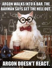 Chemistry Cat (sometimes known as Science Cat) is an image macro series which consists of a scientific pun and a picture of a cat with a bow-tie and glasses sitting in front of a board. These puns are usually based on the names of chemical elements from the periodic table or various laws of science and physics.